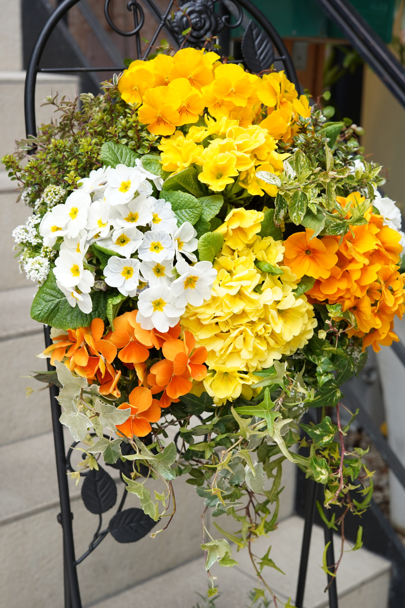 さて、今回はビタミンカラーでフレッシュに、春の花々でハンギングをおつくりしました。