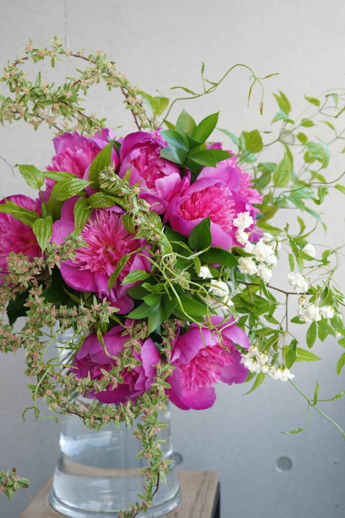 丸く咲く大輪のシャクヤクと、躍動感のあるコデマリやリキュウソウで動きをつけて、どの角度からも楽しめるものです。